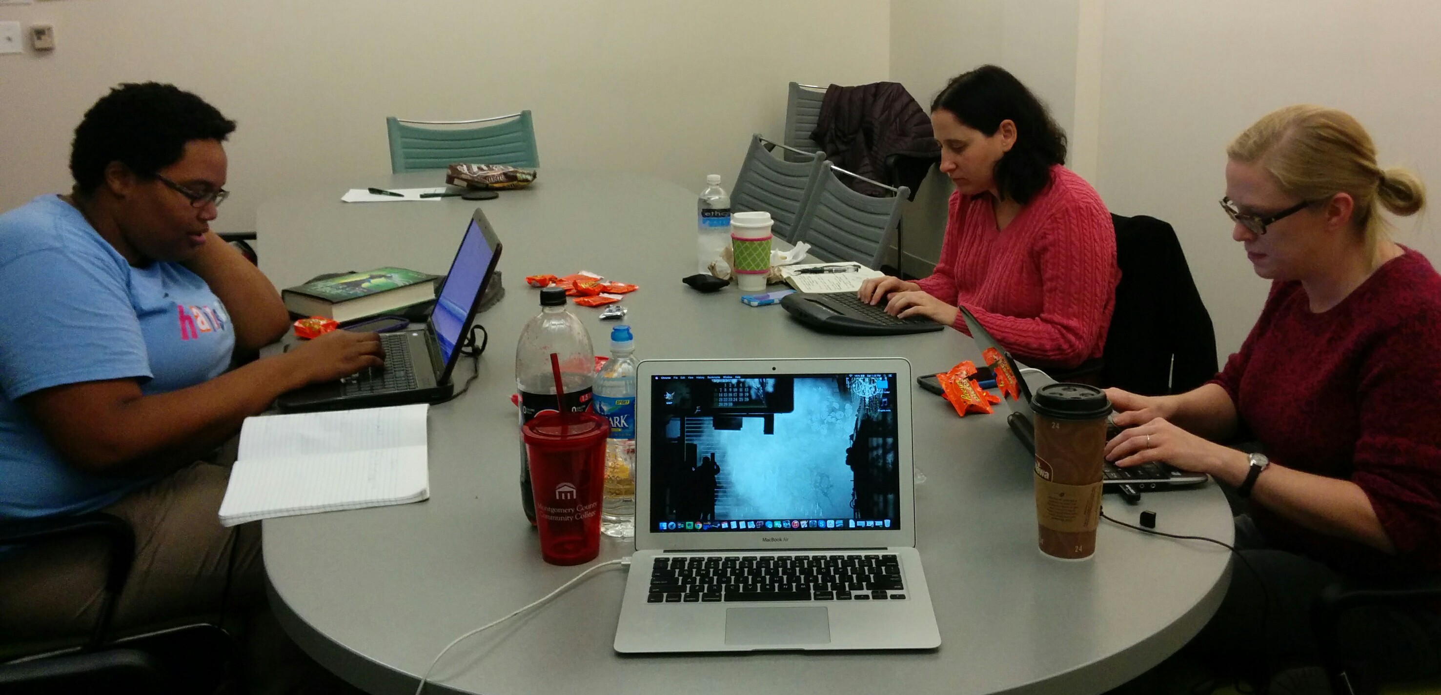 Notice all the coffee, soda pop, and candy (aptly provided through the means of discounted Halloween candy sales and Trick r Treaters who didn’t nab it all) on the table between my Nano-mates. Yesterday was just the beginning. 1-6-6-7 words or more everyday this month. The energy is high right now…but the snacks and goodies will be especially required about mid-way through the month.